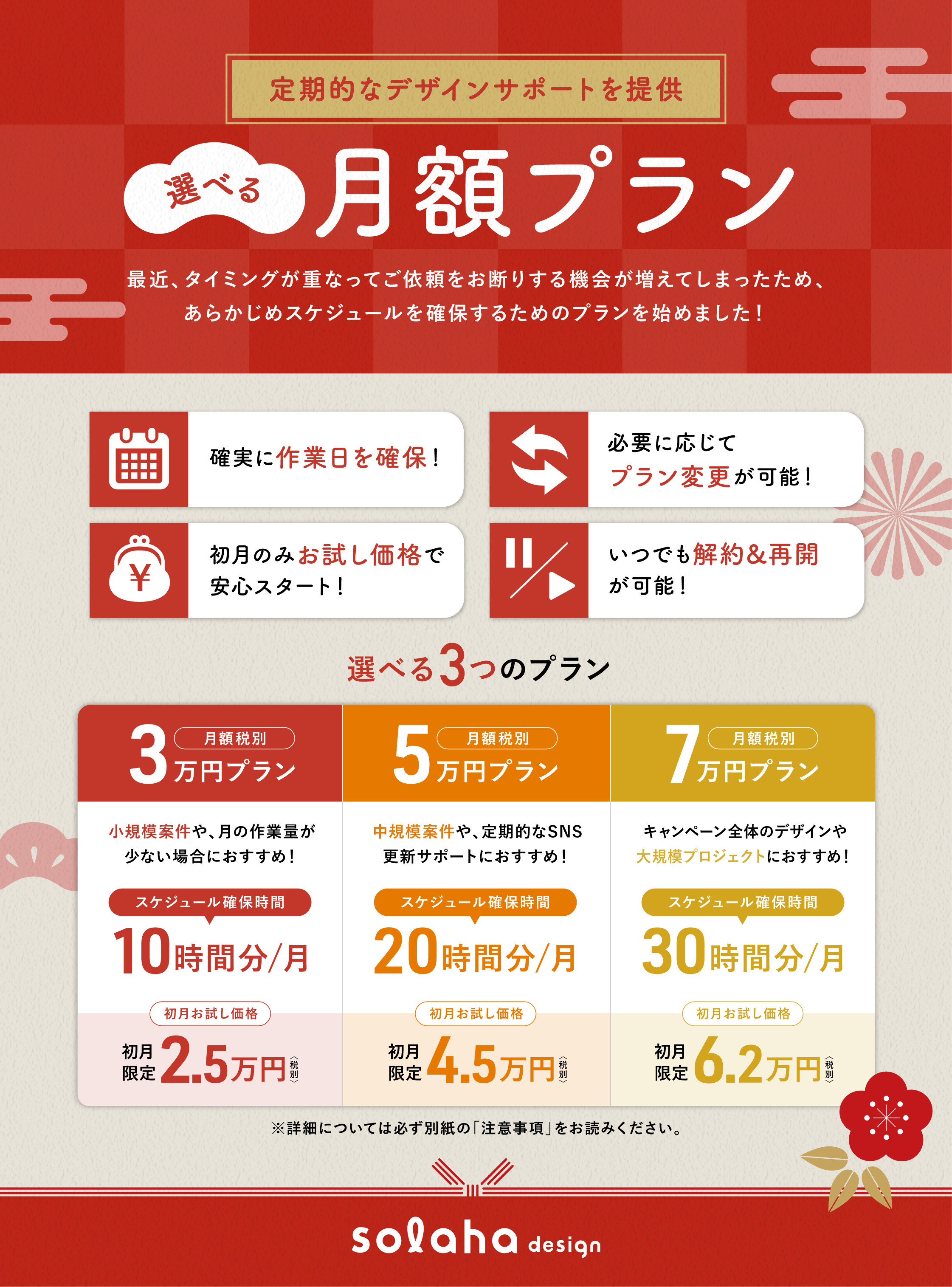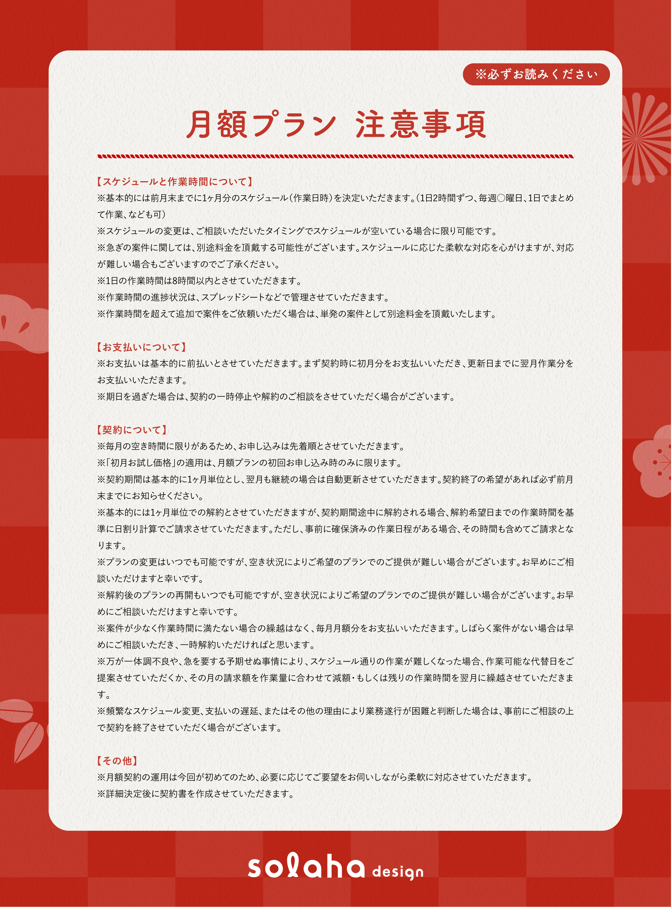 さて、このたび新しく「月額プラン」を始めました!詳細についてはお気軽にご相談ください。